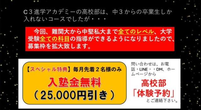 学習塾が皆さんに提供できるサービスには限りがあります。実際に大したことはできません。それでも、私たちの塾を、C3進学アカデミーを選んでくれた「あなた」に成績だけではなく、「人間としての成長」を提供したいと思っています。