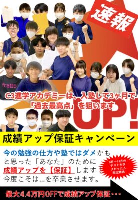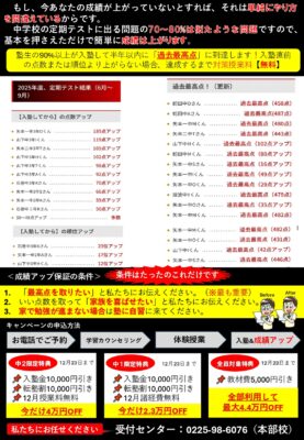 ✅当塾では、塾生の90%以上が入塾して半年以内に「過去最高点」に到達します!入塾直前の点数または順位より上がらない場合、達成するまで対策授業料【無料】に致します。