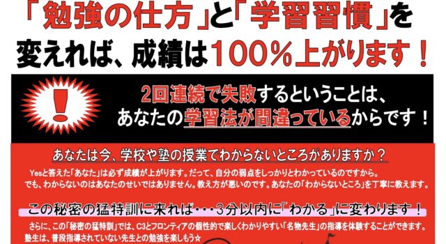 石巻市・東松島市・豊里町・女川町・仙台市で、小学生・中学生・高校生のお子様をお持ちの保護者様へ。 他の塾で成績が伸びなかったお…